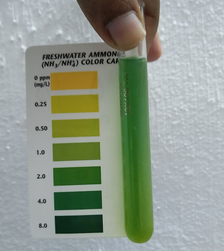 Blueweight field technician Mr. Satish Allu visited the pond and collected a water sample. At the Blueweight laboratory in Kalidindi, Krishna District, the sample was tested using an API ammonia test kit. The result was clear — pond total ammonia had risen to 1.5 ppm due to high nitrification at this late stage of the culture cycle.